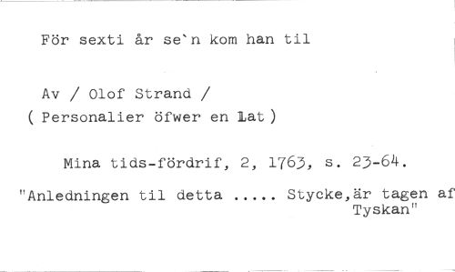 För sexti år se'n kom han til //// Av / Olof Strand //// /( Personalier öfwer en lat) //// Mina tids-fördrif, 2, 1763, s. 23-64. //// "Anledningen til detta Stycke,är tagen af //// Tyskan"
