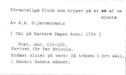 Förakteliga Flock som kryper på et et- af de //// minsta //// Av A.A. Stjernecrantz //// ( Tal på Barbara Dagen Anno: 1784 ) //// Poet. skr. 114-128. //// Skrivet för Par Bricole. //// Endast slutet på vers: Så träden i Ert kall, I Bachii Embets männer.