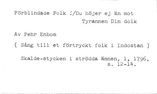 Förblindade Folk :/Du höjer ej än mot //// Tyrannen Din dolk //// Av Pehr Enbom //// ( Sång till et förtryckt folk i Indostan ) //// Skalde-stycken i strödda ämnen, 1, 1796, //// s. 12-14.