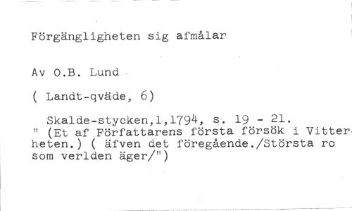 Förgängligheten sig afmålar //// Av O.B. Lund //// ( Landt-qväde, 6) //// Skalde-stycken,1,1794, s. 19 - 21. //// " (Et af Författarens första försök i Vitter, heten.) ( äfven det föregående./Största ro som verlden äger/")
