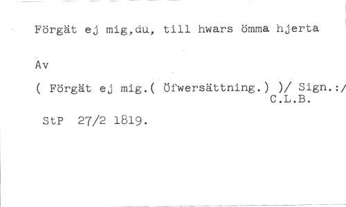 Förgät ej mig,au, till hwars ömma hjerta Av //// ( Förgät ej mig.( öfwersättning.) )/ Sign.: //// /C.L.B. //// StP 27/2 1819.