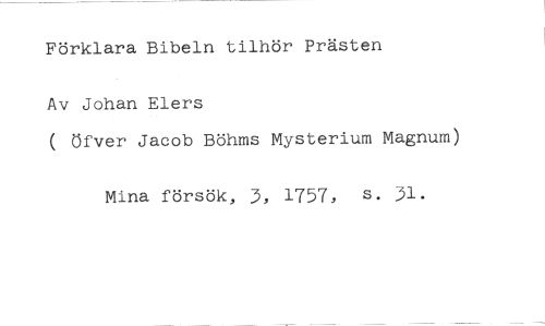 Förklara Bibeln tilhör Prästen //// Av Johan Elers //// ( Öfver Jacob Böhms Mysterium Magnum) //// Mina försök, 3, 1757, s. 31.