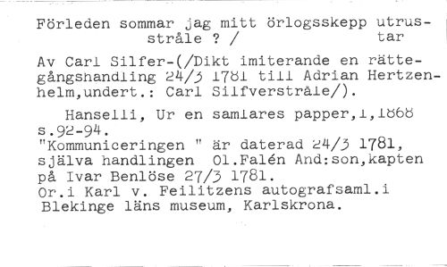 Förleden sommar jag mitt örlogsskepp utrus- //// stråle ? / tar //// Av Carl Silfer-(/Dikt imiterande en rättegångshandling 24/3 1781 till Adrian Hertzenhelm,undert.: Carl Silfverstråle/). //// Hanselli, Ur en samlares papper,1,186b s.92-94. //// "Kommuniceringen " är daterad '24/3 1781, själva handlingen 01.Fal6n And:son,kapten på Ivar Benlöse 27/3 1781. //// Or.i Karl v. Feilitzens autografsaml.i Blekinge läns museum, Karlskrona.