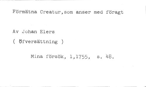 Förmätna Creatur,som anser med föragt //// Av Johan Elers //// ( öfversättning ) //// Mina försök, 1,1755, s. 48.
