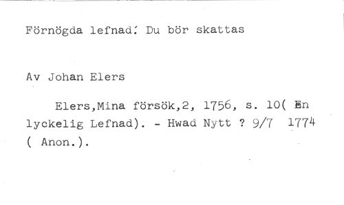 Förnögda lefnad: Du bör skattas //// Av Johan Elers //// Elers,Mina försök,2, 1756, s. 10( En lyckelig Lefnad). - Hwad Nytt ? 9/7 1774 ( Anon.).