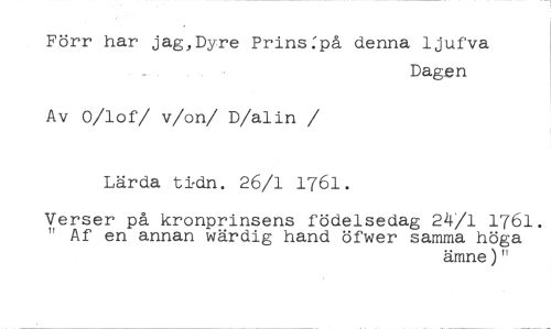 Förr har jag,Dyre Prinsspå denna ljufva //// Dagen. //// Av 0/1of/ v/on/ D/alin / Lärda tidn. 26/1 1761. //// Verser på kronprinsens födelsedag 24/1 1761. " Af en annan wärdig hand öfwer samma höga //// ämne)"