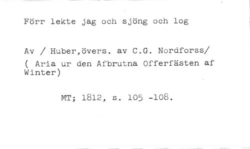 Förr lekte jag och sjöng och log //// Av / Huber,övers. av C.G. Nordforss //// /( Aria ur den Afbrutna Offerfästen af Winter) //// MT; 1812, s. 105 -108.