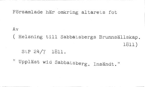 Församlade här omkring altarets fot //// Av //// ( Helsning till Sabbatsbergs Brunnsällskap. //// 1811) //// StP 24/7 1811. //// " Uppläst wid Sabbatsberg. Insändt."