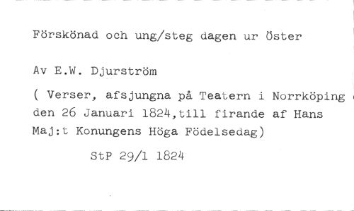 Förskönad och ung/steg dagen ur Öster Av E.W. Djurström //// ( Verser, afsjungna på Teatern i Norrköping den 26 Januari 182k,till firande af Hans Maj:t Konungens Höga Födelsedag) //// StP 29/1 1824