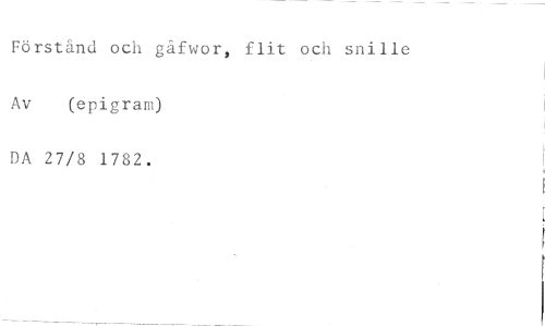 Förstånd och gåfwor, flit och snille //// Av (epigram) //// DA 27/8 1782.