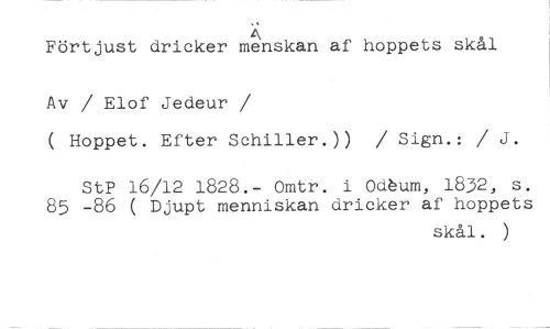 Förtjust dricker menskan af hoppets skål //// Av / Elof Jedeur //// /( Hoppet. Efter Schiller.)) / Sign.: / J. //// StP 16/12 1828.- Omtr. i Odum, 1832, s. 85 -86 ( Djupt menniskan dricker af hoppets //// skål. )
