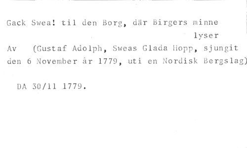 Gack Swea! til den Borg, där Birgers minne //// lyser //// Av (Gustaf Adolph, Sweas Glada [lopp, sjungit //// den 6 November år 1779, uti en Nordisk Bergslag) //// DA 30/11 1779.