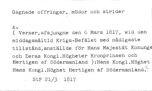Gagnade offringar, mödor och strider //// Av //// ( Verser,afsjungne den 6 Mars 1817, wid den //// middagsmåltid Krigs-Befälet med nådigaste tillstånd,anställde för Hans Majestät KonungE //// och Deras Kongl.Högheter Kronprinsen och Hertigen af Södermanland ):Hans Kongl.Höghet //// Hans Kongl.Höghet Hertigen af Södermanlane StP 21/3 1817