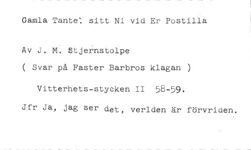 Gamla Tante: sitt Ni vid Er Postilla //// Av J. M. 8tjernstolpe //// ( Svar på Faster Barbros klagan ) //// Vitterhets-stycken II 58-59. //// Jfr Ja, jag ser det, verlden är förvriden.