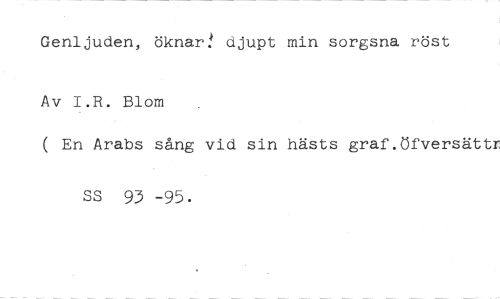 Genljuden, öknar! djupt min sorgsna röst //// Av I.R. Blom //// ( En Arabs sång vid sin hästs graf.öfversättr //// SS 93 -95.