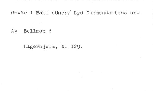 Gewär i Baki söner/ Lyd Commendantens ord. //// Av Bellman ? //// Lagerhjelm, s. 129.
