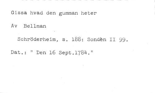 Gissa hvad den gumman heter Av Bellman //// Schröderheim, s. 188: Sondfin II 99. Dat.: " Den 16 Sept.1784."