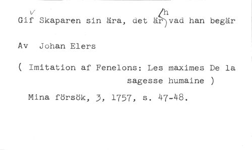 v //// Gif Skaparen sin ära, det ärvad han begär //// Av Johan Elers //// ( Imitation af Fenelons: Les maximes De la //// sagesse humaine ) //// Mina försök, 3, 1757, s. 47-48.