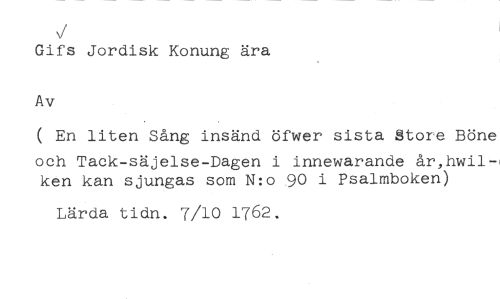 V //// Gifs Jordisk Konung ära //// Av //// ( En liten Sång insänd öfwer sista Store Böne //// och Tack-säjelse-Dagen i innewarande år,hwil-, ken kan sjungas som N:o 90 i Psalmboken) //// Lärda tidn. 7/10 1762.