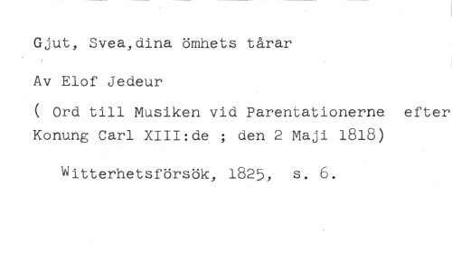 Gjut, Svea,dina ömhets tårar Av Elof Jedeur //// ( Ord till Musiken vid Parentationerne. efter Konung Carl XIII:de ; den 2 Maji 1818) //// vitterhetsförsök, 1825, s. 6.