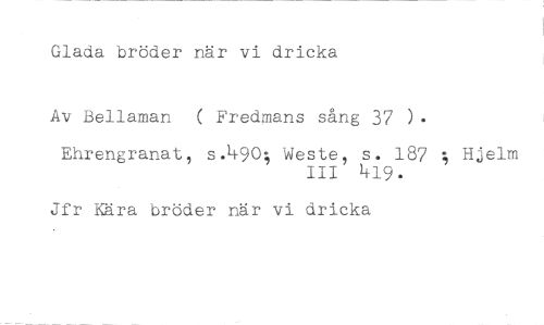 Glada bröder när vi dricka //// Av Bellaman ( Fredmans sång 37 ). //// Ehrengranat, s.490; Wester s. 187 ; Hjelm //// III 419. //// Jfr Kära bröder när vi dricka