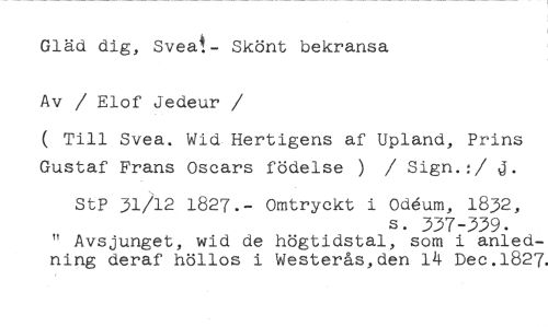Gläd dig, Svea- Skönt bekransa Av / Elof Jedeur //// /( Till Svea. Wid Hertigens af Upland, Prins Gustaf Frans Oscars födelse ) / Sign.:/ j. //// StP 31/12 1827.- Omtryckt i Od6m, 1832, //// s. 337-339. //// " Avsjunget, wid de högtidstal, som i anled- //// ning deraf höllos i Westerås,den i4 Dec.1827.