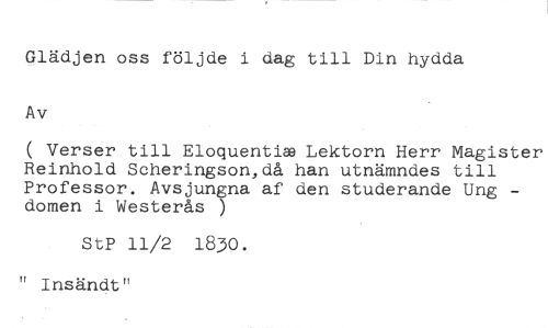 Glädjen oss följde i dag till Din hydda Av //// ( Verser till Eloquentim Lektorn Herr Magister Reinhold Scheringson,då han utnämndes till Professor. Avsjungna af den studerande Ung - domen i Westerås ) //// StP 11/2 1830. " Insändt"