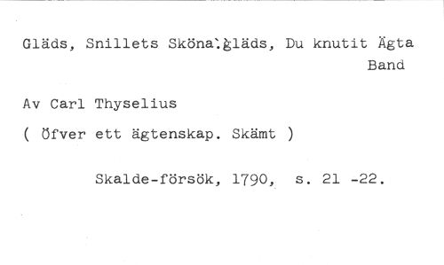 Gläds, Snillets Sköna:kläds, Du knutit Ägta //// Band //// Av Carl Thyselius //// ( öfver ett ägtenskap. Skämt ) //// Skalde-försök, 1790, s. 21 -22.