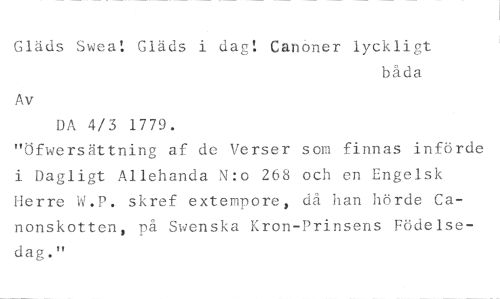 Gläds Swea: Gläds i dag! Canoner lyckligt //// båda //// DA 4/3 1779. //// "Öfwersättning af de Verser som finnas införde i Dagligt Allehanda N:o 268 och en Engelsk Herre W.P. skref extempore, då han hörde Canonskotten, på Swenska Kron-Prinsens Födelsedag."
