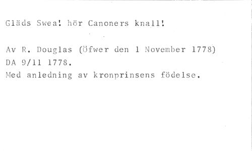 Gläds Swea! hör Canoners knall! //// Av R. Douglas (Öfwer den 1 November 1778) DA 9/11 1778. //// Med anledning av kronprinsens födelse.