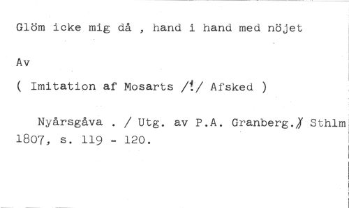 Glöm icke mig då , hand i hand med nöjet //// Av //// ( Imitation af Mosarts /!/ Afsked ) //// Nyårsgåva . / Utg. av P.A. Granberg.j Sthlm 1807, s. 119 - 120.