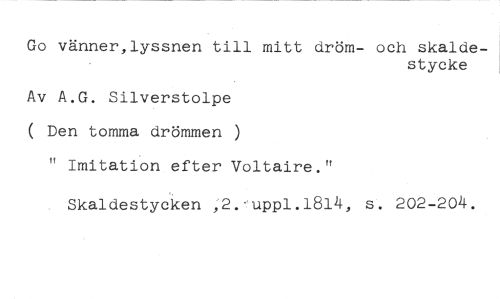 Go vänner,lyssnen till mitt dröm- och skalde- //// stycke //// Av A.G. Silverstolpe ( Den tomma drömmen ) //// tt Imitation efter Voltaire." //// Skaldestycken ,2.-upp1.1814, s. 202-204.