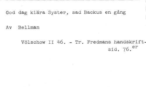 God dag kiära Syster, sad Backus en gång //// Av Bellman //// Völschow II 46. - Tr. Fredmans handskrift- //// sid. 76er //// .