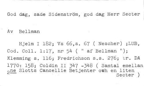 God dag, sade Sidenström, god dag Herr Secter Av Bellman //// Hjelm I 182; Vs 66,s. 67 ( Nescher) ;LUB, Cod. Coli. 1:17, nr 54 ( " af Bellman "); Klemming s. 116; Fredrichson s.s. 276; tr. DA //// 1770: 158; Coldin II 347 -348 ( Samtal emellan 2ne Slotts Cancellie Betjenter (puh en liten //// Secter )