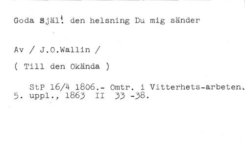 Goda Själ{ den helsning Du mig sänder //// Av / J.O.Wallin / ( Till den Okända //// StP 16/4 1806.- Omtr. i Vitterhets-arbeten. 5. uppl., 1863 II 33 -38.