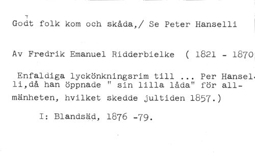 7 //// Godt folk kom och skåda,/ Se Peter Hanselli //// Av Fredrik Emanuel Ridderbielke ( 1821 - 1870 //// Enfaldiga lyckönkningsrim till ... Per Hansel. li,då han öppnade " sin lilla låda" för all- //// mänheten, hvilket skedde jultiden 1857.) I: Blandsäd, 1876 -79.