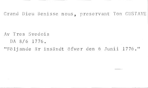 Grand Dieu Benisse nous, preservant Ton GUSTAVE //// Av Tres Svedois DA 8/6 1776. //// "Följande är insändt öfwer den 6 Junii 1776."