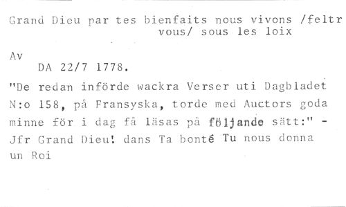 Grand Dieu par tes bienfaits nous vivons /feltr //// vous/ sous les loix //// Av //// DA 22/7 1778. //// "De redan införde wackra Verser uti Dagbladet N:o 158, på Fransyska, torde med Auctors goda minne för i dag få läsas på följande sätt:" Jfr Grand Dieut dans Ta bont6 Tu nous donna un Roi