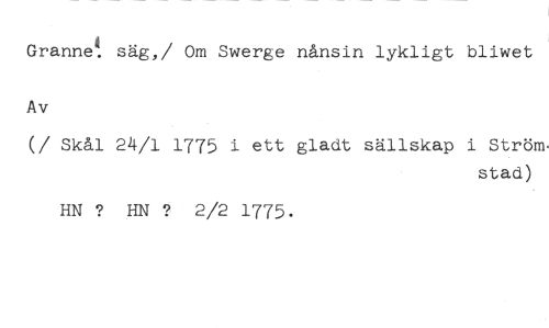 - //// Granne.4 säg,/ Om Swerge nånsin lykligt bliwet //// Av //// (/ Skål 24/1 1775 i ett gladt sällskap i Ström, //// stad) //// HN HN ? 2/2 1775.