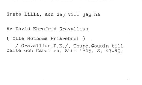Greta lilla, ach dej vill jag ha //// Av David Ehrnfrid Gravallius ( 011e Nötboms Friarebref ) //// / Gravallius,D.E./, Thure,Cousin till Calle och Carolina. Sthm 1845. S. 47-49.