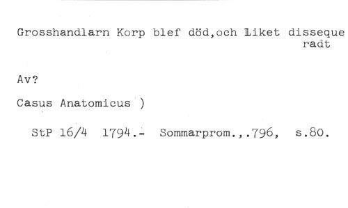 Grosshandlarn Korp blef död,och liket disseque //// radt //// Av? //// Casus Anatomicus ) //// StP 16/4 1794.- Sommarprom.,.796, s.80.
