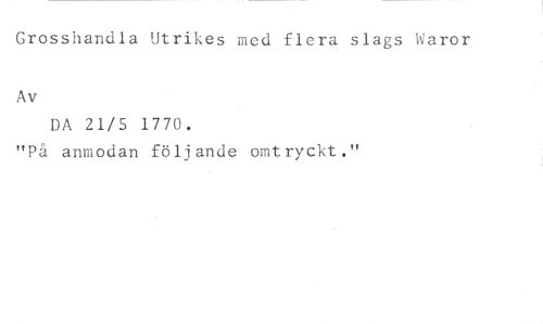 Grosshandla Utrikes med flera slags Waror //// Av //// DA 21/5 1770. //// "På anmodan följande omtryckt."