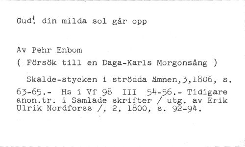 Gudt din milda sol går opp //// Av Pehr Enbom //// ( Försök till en Daga-Karls Morgonsång ) Skalde-stycken i strödda ämnen,3,1806, s. //// 63-65.- Hs i yr 98 III 54-56.- Tidigare anon.tr. i Samlade skrifter / utg. av Erik Ulrik Nordforss /, 2, 1800, s. 92-94.
