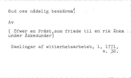 Gud oss nådelig beskärmal. Av //// ( öfwer en Präst,som friade til en rik Änka under Åskedunder) //// Samlingar af witterhetsarbeteb, 1, 1771, //// s. 32.
