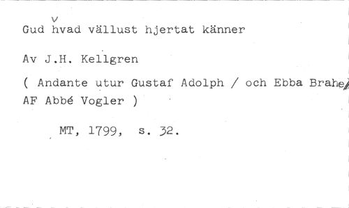 v //// Gud hvad vällust hjertat känner //// Av J.H. Kellgren //// ( Andante utur Gustaf Adolph / och Ebba Brah4 AF Abbe Vogler ) //// MT, 1799, s. 32.