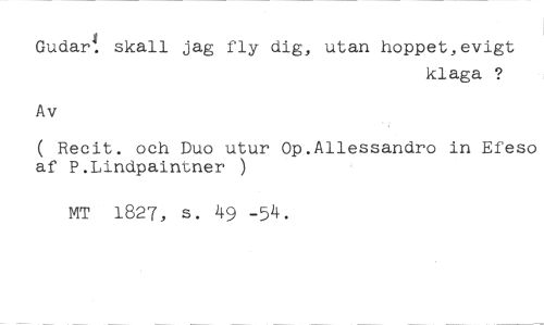 Gudar. skall jag fly dig, utan hoppet,evigt //// klaga ? //// Av //// ( Recit. och Duo utur Op.Allessandro in Efeso af P.Lindpaintner ) //// NT 1827, s. 49 -54.
