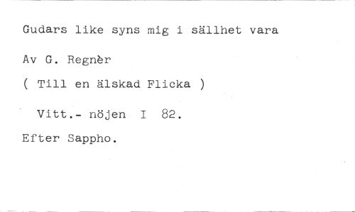 Gudars like syns mig i sällhet vara //// Av G. Regnbr //// ( Till en älskad Flicka ) //// Vitt.- nöjen I 82. Efter Sappho.