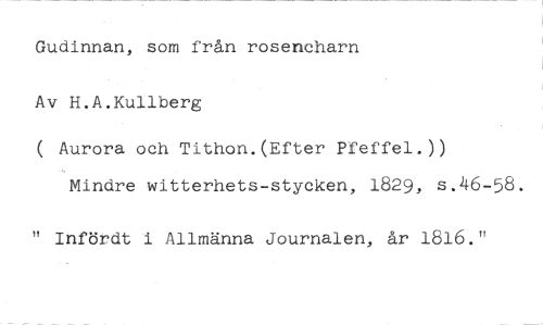 Gudinnan, som från rosenoharn Av H.A.Kullberg //// ( Aurora och Tithon.(Efter Pfeffel.)) //// Mindre witterhets-stycken, 1829, s.46-58. //// " Infördt i Allmänna Journalen, år 1816."