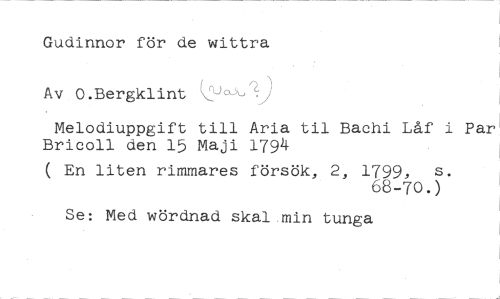 Gudinnor för de wittra Av O.Bergklint //// Melodiuppgift till Aria til Bachi Låf i Bricoll den 15 Maji 1794 //// ( En liten rimmares försök, 2, 1799, s. //// 68-70.) //// Se: Med wördnad skal min tunga //// Par'