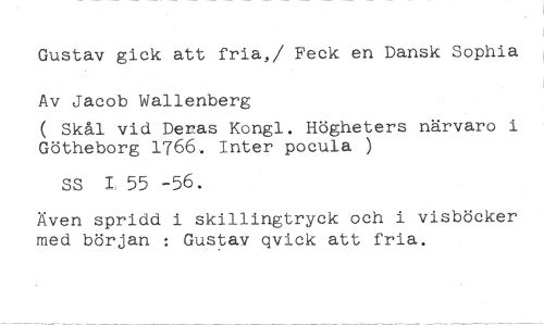 Gustav gick att fria,/ Feck en Dansk Sophia Av Jacob Wallenberg //// ( Skål vid Deras Kongl. Högheters närvaro i Götheborg 1766. Inter pocula ) //// SS I 55 -56. //// Även spridd i skillingtryck och i visböcker med början : Gustav qvick att fria.